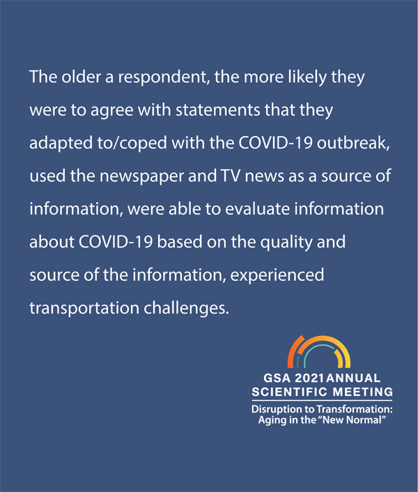 Dr. Laurie Blackman and Dr. Kathryn Krase, along with three Wurzweiler students—Joyce Roberson-Steele, Annette Clarke-Jones and Latoya Attis—and Dr. Donna Wang of Springfield College presented a poster at the Gerontological Society of America’s 2021 Annual Scientific Meeting, “Disruption to Transformation: Aging in the ‘New Normal’,” held online from November 10-13, 2021.Titled “Adaptability of Older Adults at the Onset of the COVID-19 Pandemic,” the data presented in the poster led to the conclusion that “the older a respondent, the more likely they were to agree with statements that they adapted to/coped with the COVID-19 outbreak, used the newspaper and TV news as a source of information, were able to evaluate information about COVID-19 based on the quality and source of the information, [and] experienced transportation challenges.”